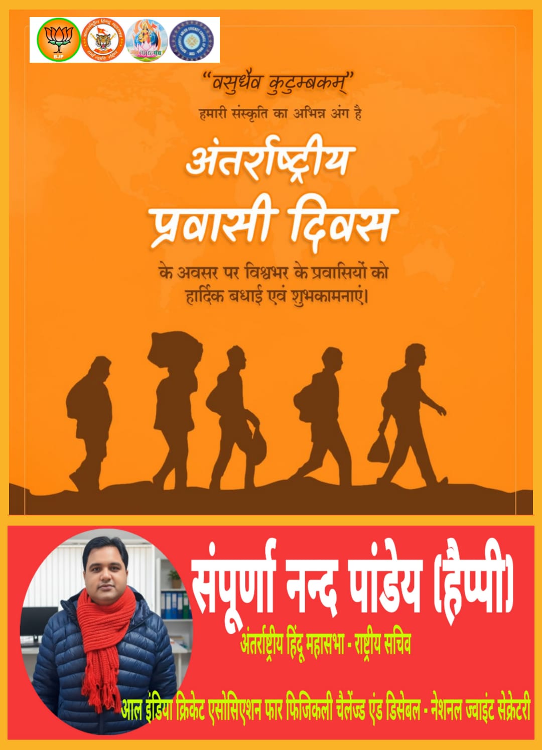 संपूर्ण नंद पांडेय ने अपने संदेश में कहा कि प्रवासी हमारे समाज का एक महत्वपूर्ण और अभिन्न हिस्सा हैं। वे अपने देश से दूर रहकर भी न केवल अपने परिवार, समाज और समुदाय के लिए कार्य करते हैं, बल्कि अपने मूल देश की प्रतिष्ठा और विकास में भी अहम भूमिका निभाते हैं। उनकी मेहनत, संघर्ष और योगदान को सम्मान दिया जाना चाहिए।