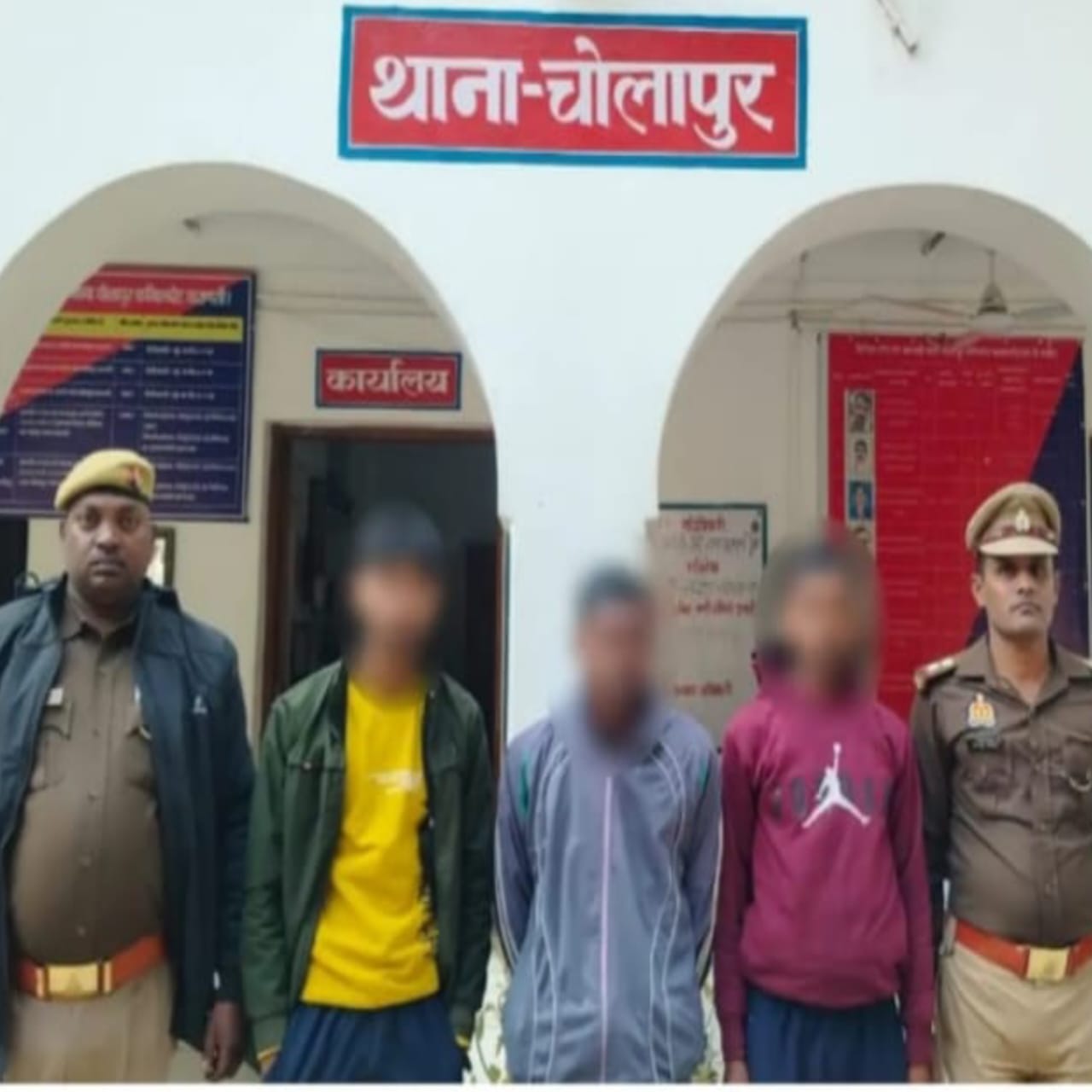 थानाध्यक्ष दीपक कुमार ने बताया कि शनिवार दोपहर पुलिस टीम ने ग्राम ताड़ी जाने वाले मार्ग के पास से सुमित राजभर (25), प्रद्युम्न राजभर (23) और मोहित राजभर (18) को गिरफ्तार किया। तीनों आरोपी ग्राम ताड़ी, थाना चोलापुर के निवासी हैं।